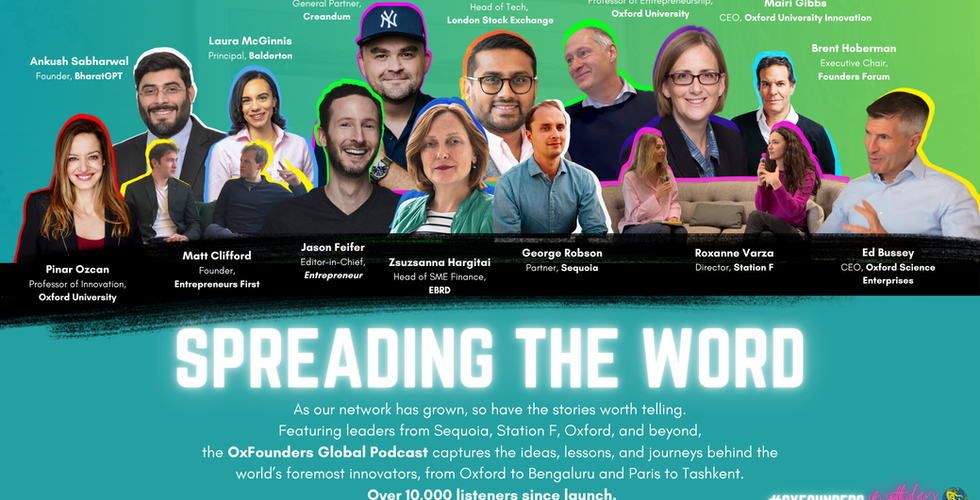We've also started creating content, and we're thrilled to have been given the chance to interview luminaries of the global innovation landscape in our OxFounders Global Podcast, including investors at top firms like Sequoia, Balderton, and Creandum, professors of innovation at Oxford University, leading entrepreneurial public figures like Matt Clifford and Brent Hoberman, and leaders of institutions making huge impact, like Station F. Since launching our podcast in 2024, we've had over 10,000 listeners across platforms, and we're only just beginning.